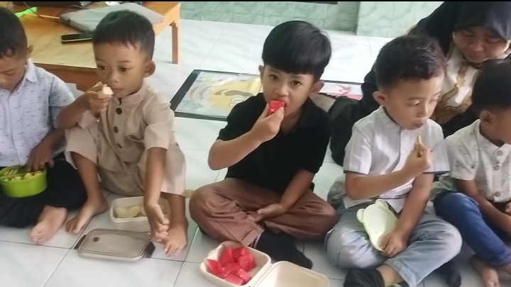 Tak lama kemudian, tibalah momen yang paling ditunggu-tunggu. Anak-anak membentuk lingkaran besar dan membuka bekal buah mereka. Warna-warni apel, pisang, jeruk, semangka, hingga buah naga menghiasi ruangan. Sambil saling menunjukkan buah favorit, mereka diajarkan untuk selalu mengucap doa sebelum makan sebagai bentuk syukur atas rezeki dari Allah SWT.