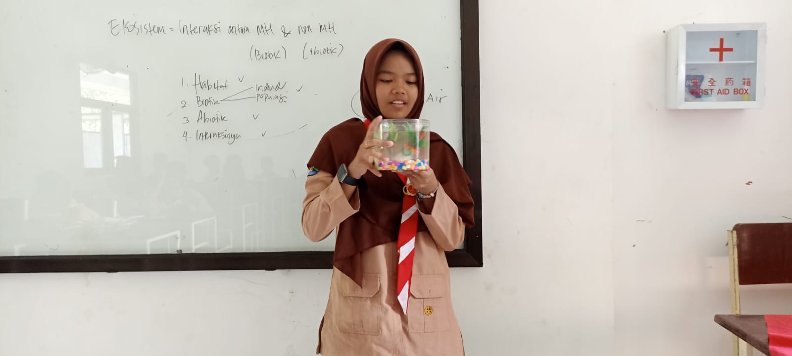 Sebagai puncak kegiatan, setiap siswa atau kelompok diberikan kesempatan untuk mempresentasikan hasil karya miniatur ekosistem mereka di depan kelas. Dengan penuh percaya diri, mereka memaparkan alur rantai makanan mini yang terjadi di dalam wadah, serta memprediksi dampak yang akan timbul apabila salah satu komponen dihilangkan.