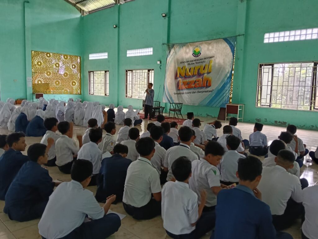 Kediri – SMP IT Nurul Izzah kembali menggelar kegiatan penuh makna melalui Bina Pribadi Islam (BPI) Akbar, Selasa (9/9) di aula sekolah. Acara ini diikuti seluruh siswa kelas 7 hingga kelas 9 dengan penuh antusias, semangat kebersamaan, dan suasana khidmat. Selasa (9/9/2025) BPI Akbar kali ini terasa lebih istimewa karena bertepatan dengan peringatan Maulid Nabi Muhammad