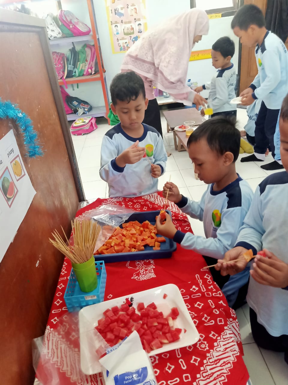 Tak hanya itu, anak-anak juga disajikan aneka buah segar, termasuk pisang dan sate buah dari pisang serta semangka. Suasana penuh keceriaan tampak di wajah para siswa saat mereka bersama-sama menikmati makanan sehat dan lezat tersebut.