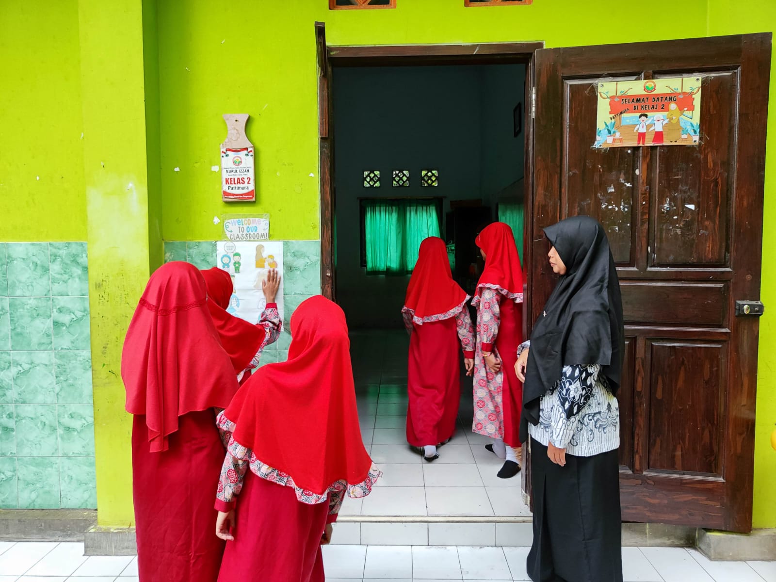 Kediri – Cuaca pagi yang sedikit mendung sama sekali tidak menyurutkan semangat para siswa. Dengan langkah riang dan wajah ceria, mereka mulai memasuki area sekolah. Tepat di depan pintu kelas, para guru telah bersiap menyambut setiap anak dengan senyuman hangat, menciptakan atmosfer belajar yang nyaman sejak detik pertama.