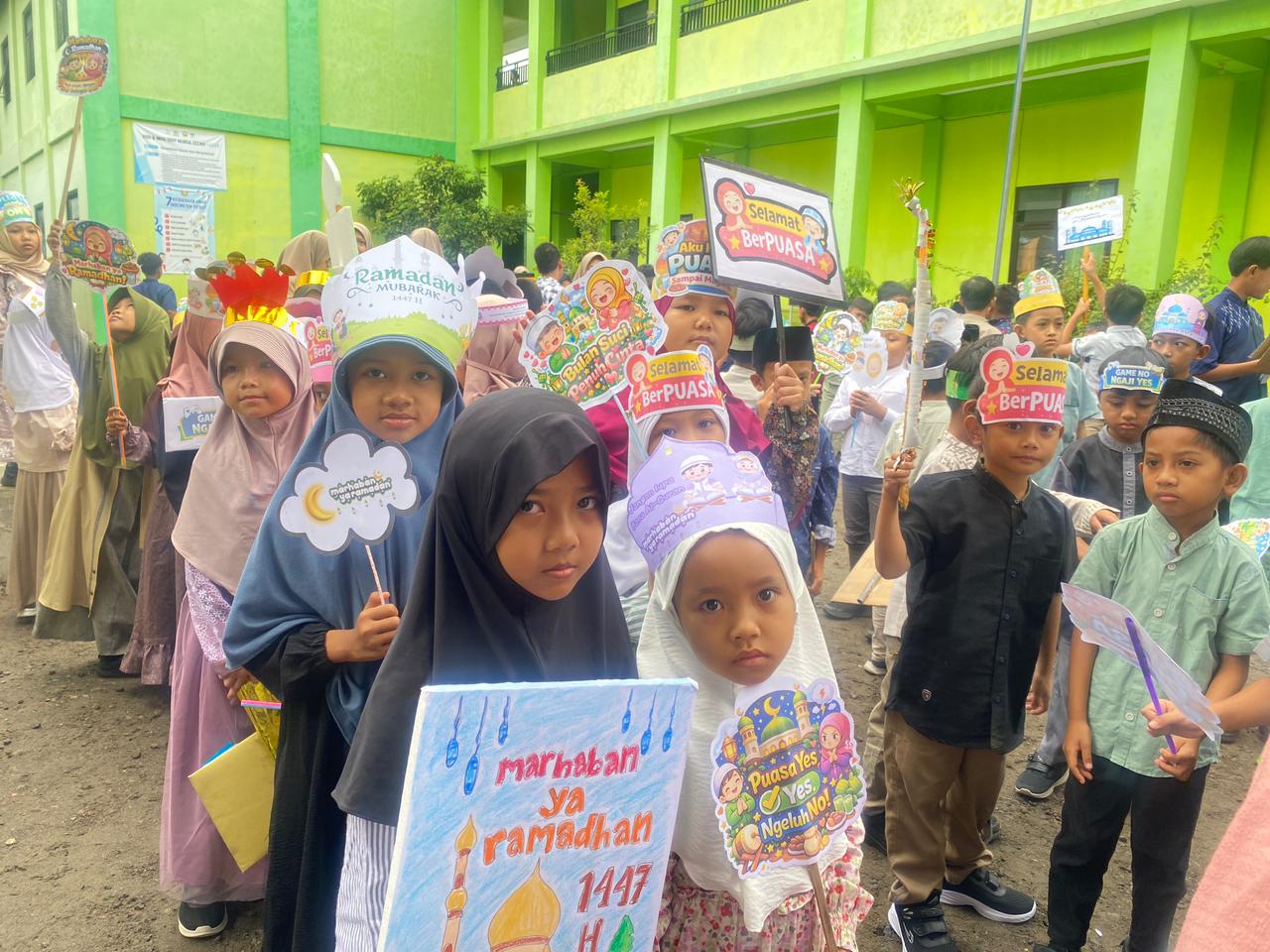 Kediri – Suasana suka cita menyelimuti lingkungan SDIT Nurul Izzah sejak pagi hari. Ratusan wajah ceria siswa tampak memenuhi halaman sekolah, lengkap dengan berbagai atribut kreatif dan poster bertema Ramadhan hasil karya mereka sendiri. Hari ini, keluarga besar SDIT Nurul Izzah menggelar Pawai Tarhib untuk menyambut datangnya bulan penuh berkah dengan hati yang gembira.